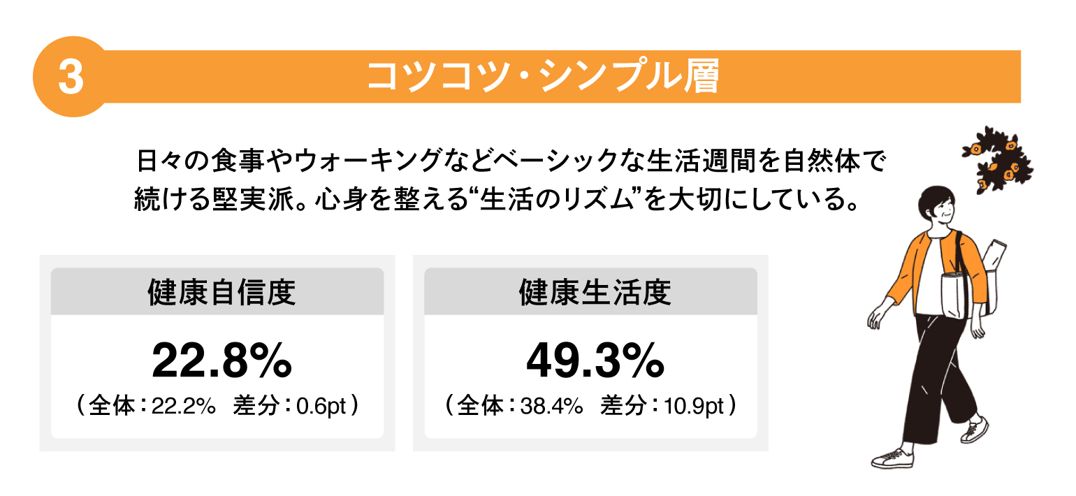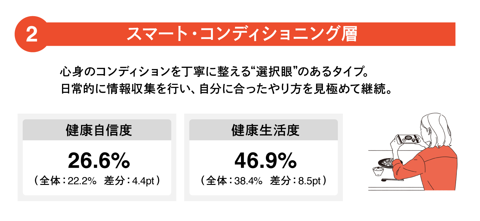 スマート・コンディショニング層は、近年広がる「心身のコンディションを整える」という潮流を端的に体現するクラスターです。仕事、家事、学習のパフォーマンス向上を主な動機とするため、この文脈でのアプローチと非常に相性が良い層といえます。