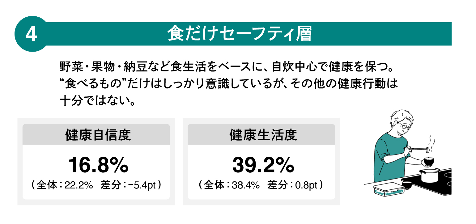 食だけセーフティ層は、特に70代に多く見られ、健康への自信も比較的低い層です。トクホ商品や機能性表示食品の利用は少なく、野菜・果物・納豆といった身近な食材を中心に、自炊による自然志向の食生活で健康を維持しようとする傾向が強い点が特徴です。