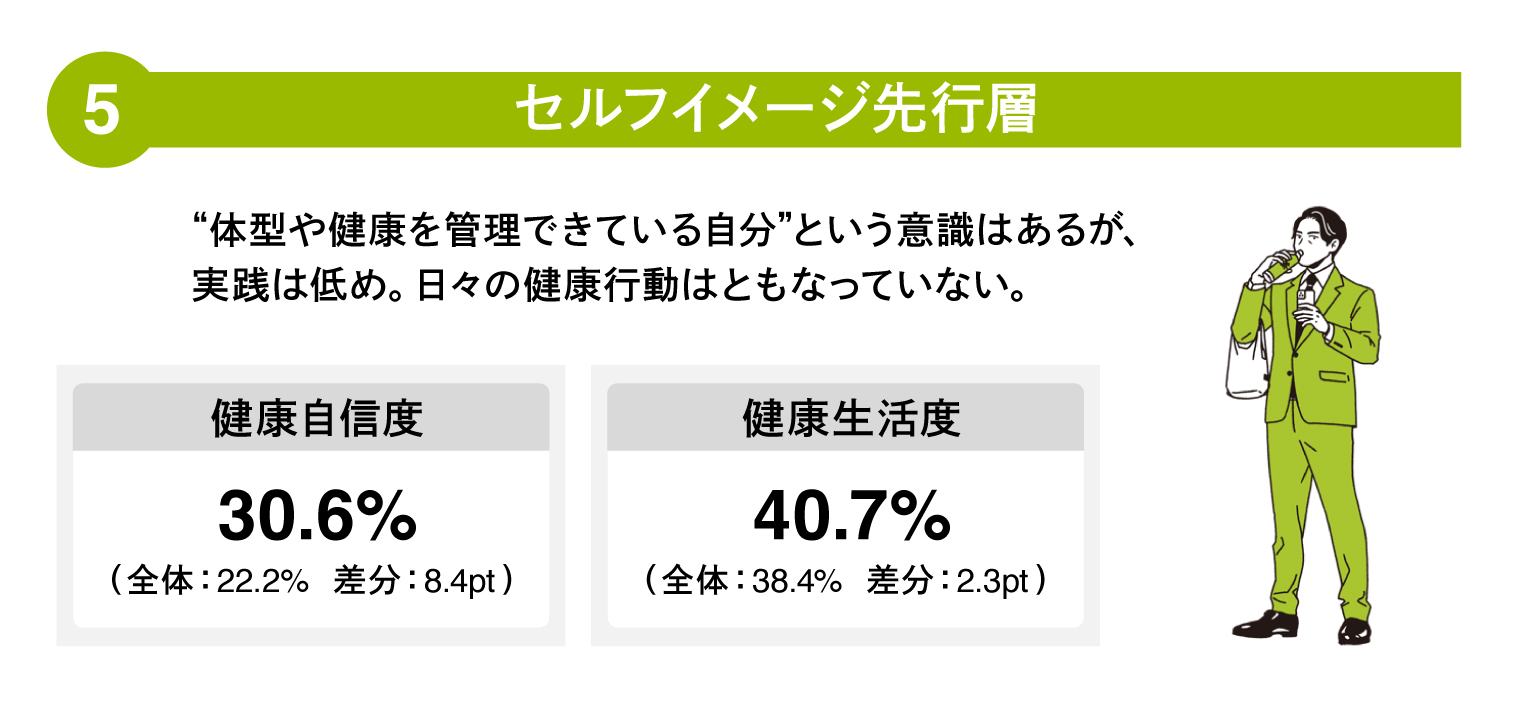 セルフイメージ先行層は、健康行動そのものは少ないものの、健康への自信は比較的高いという特徴を持つクラスターです。自身を「健康をうまく管理できている」と認識している一方で、実際の行動が伴わないケースも多く、6割を男性が占める中高年層に多く見られます。この層には、自分にふさわしいと感じられる手軽でスマートな健康習慣として提示するアプローチが有効と考えられます。