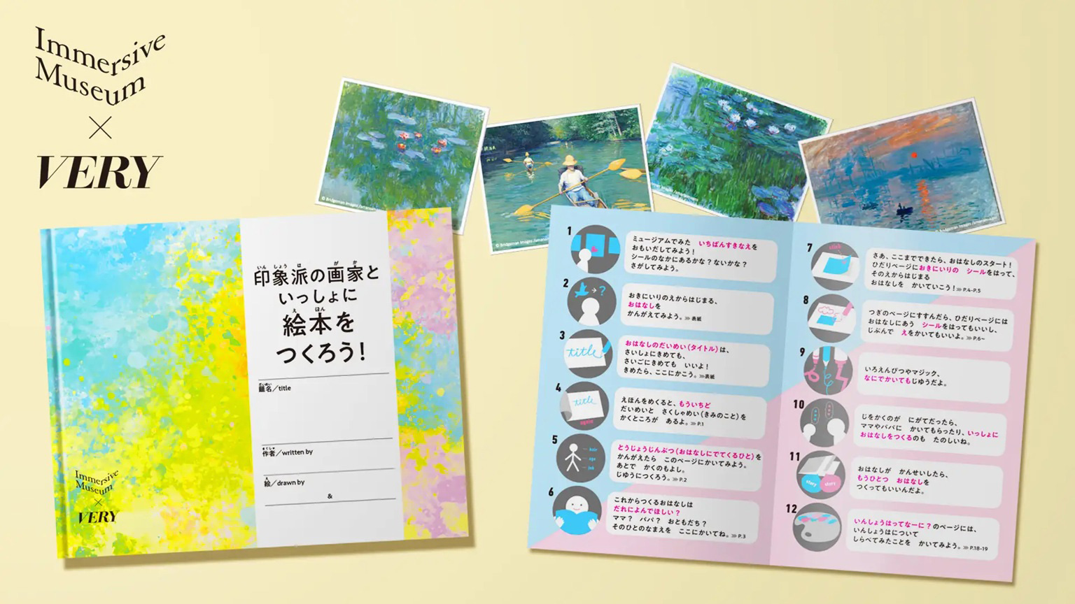 2022年は印象派の絵画シールを貼ってオリジナル絵本を作っていく「お絵かき絵本BOOK」(上写真)、2023年はゴッホ、スーラ、ゴーガンといったポスト印象派の巨匠たちの技法を学んでいく「お絵かき教室BOOK」を作製。小学生以下の来場者に無料配布された。──イマーシブミュージアムでは、「VERY」とのコラボレーション企画として、来場した子ども向けに、自分だけの絵本を作れるキットを無料配布していました。この企画は、どういう中から出てきたのでしょうか。