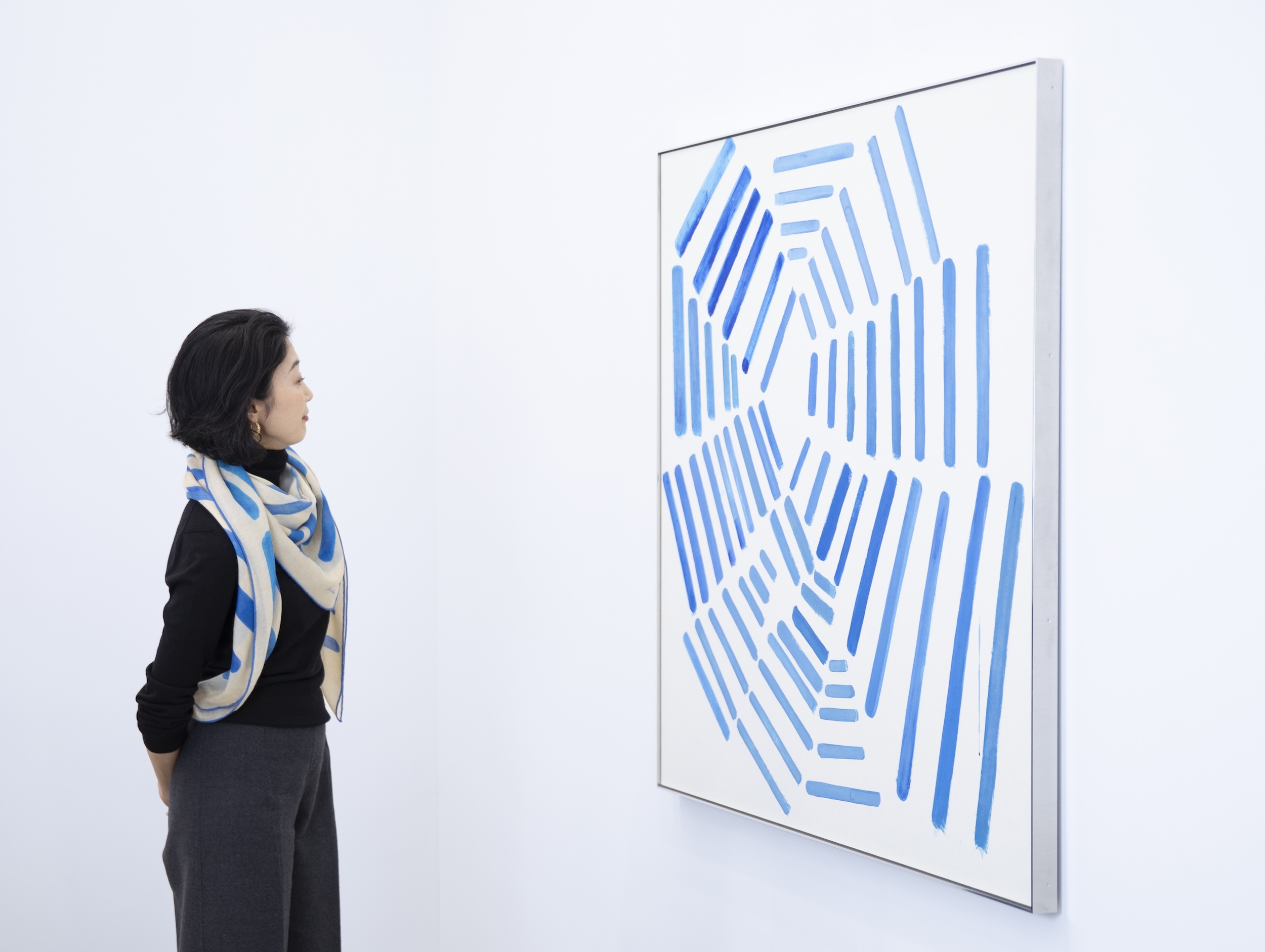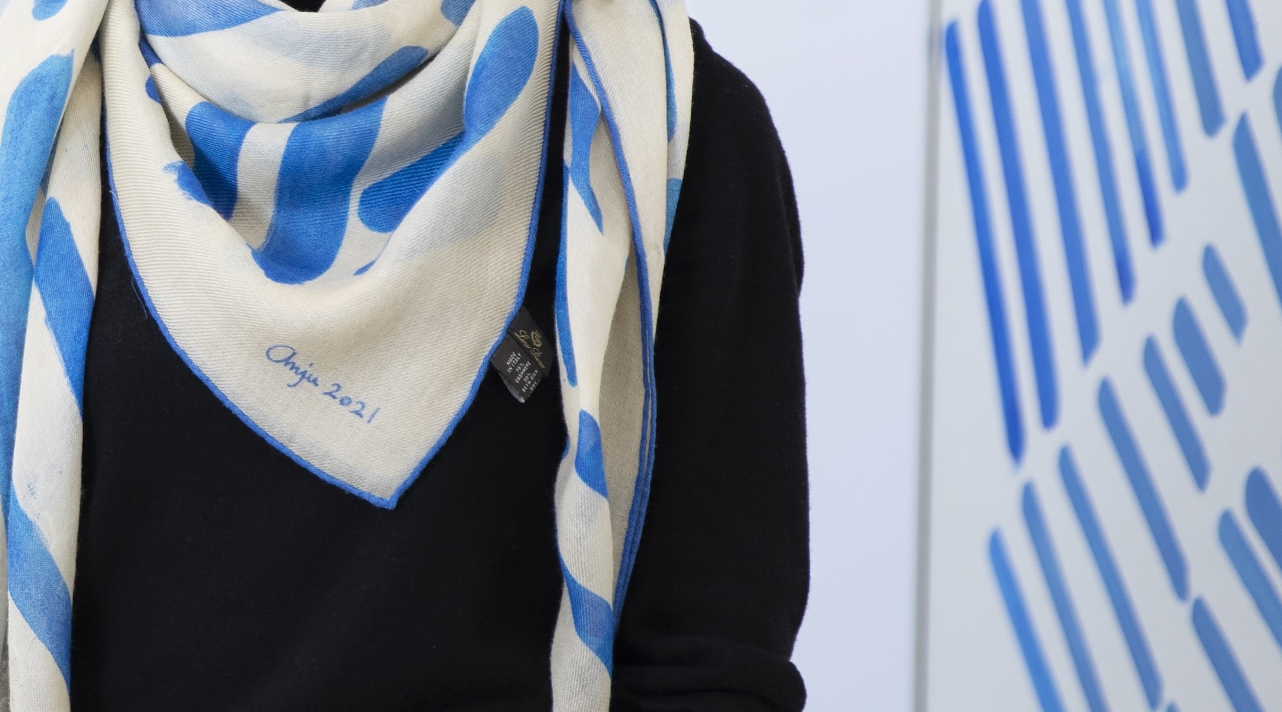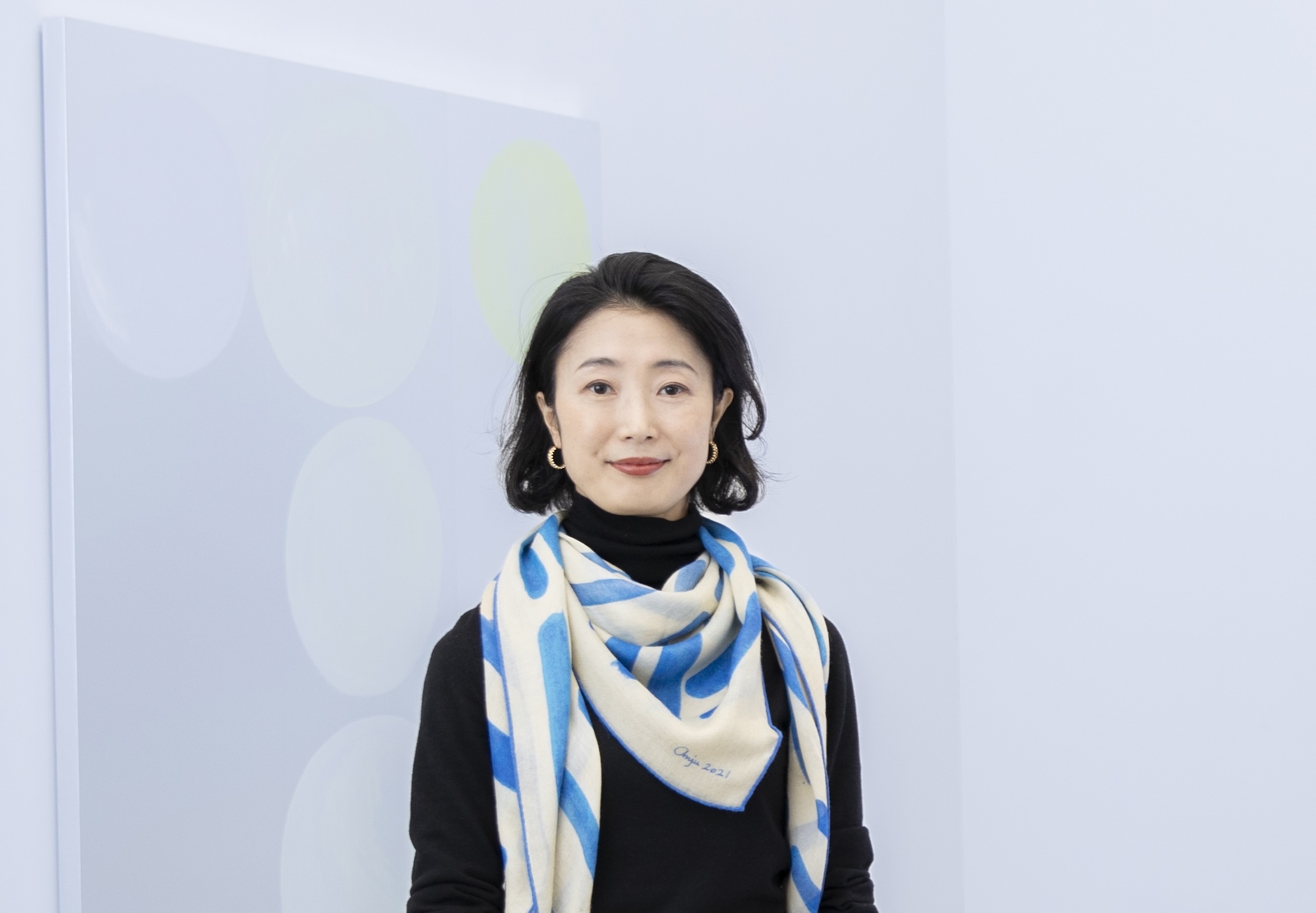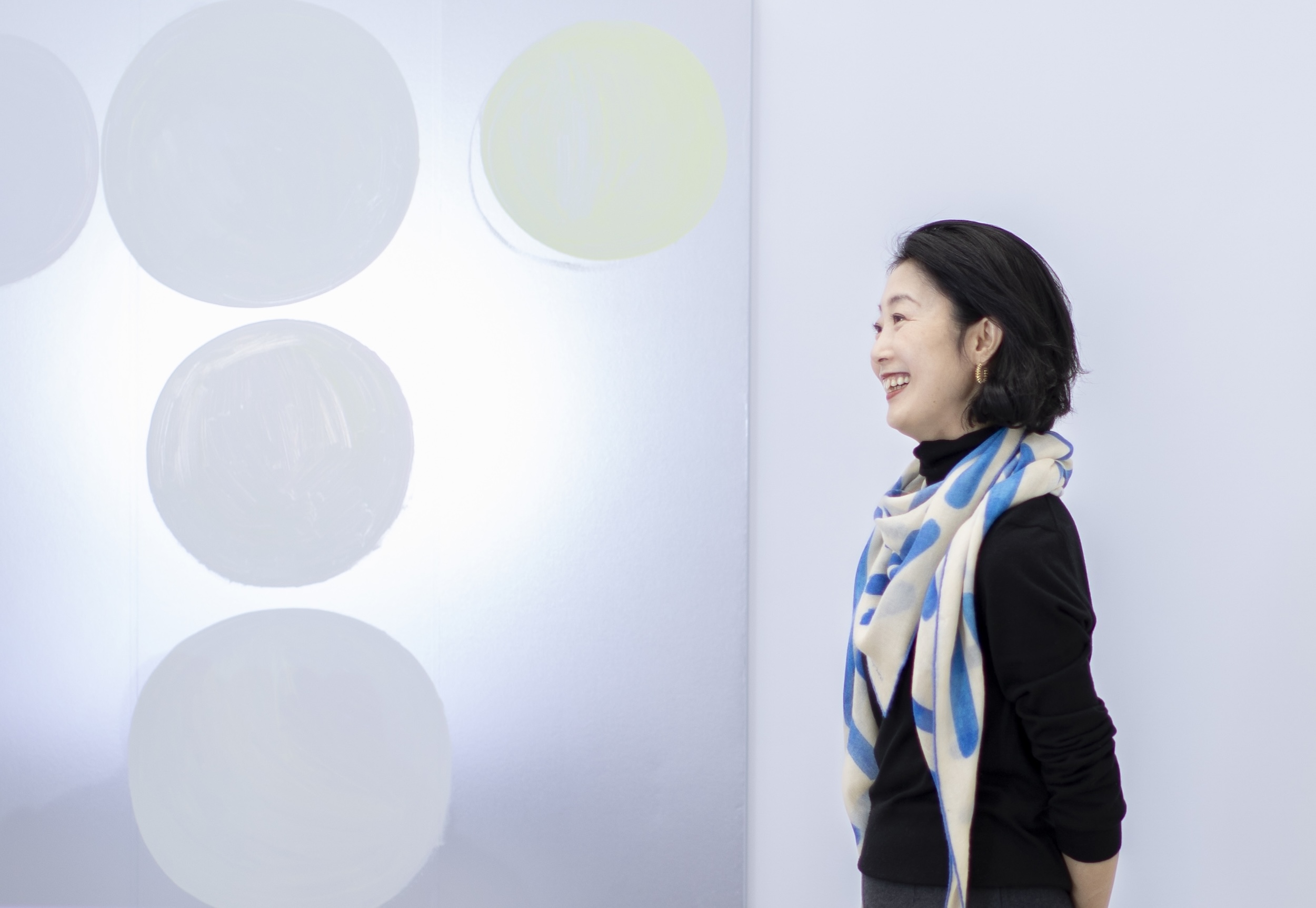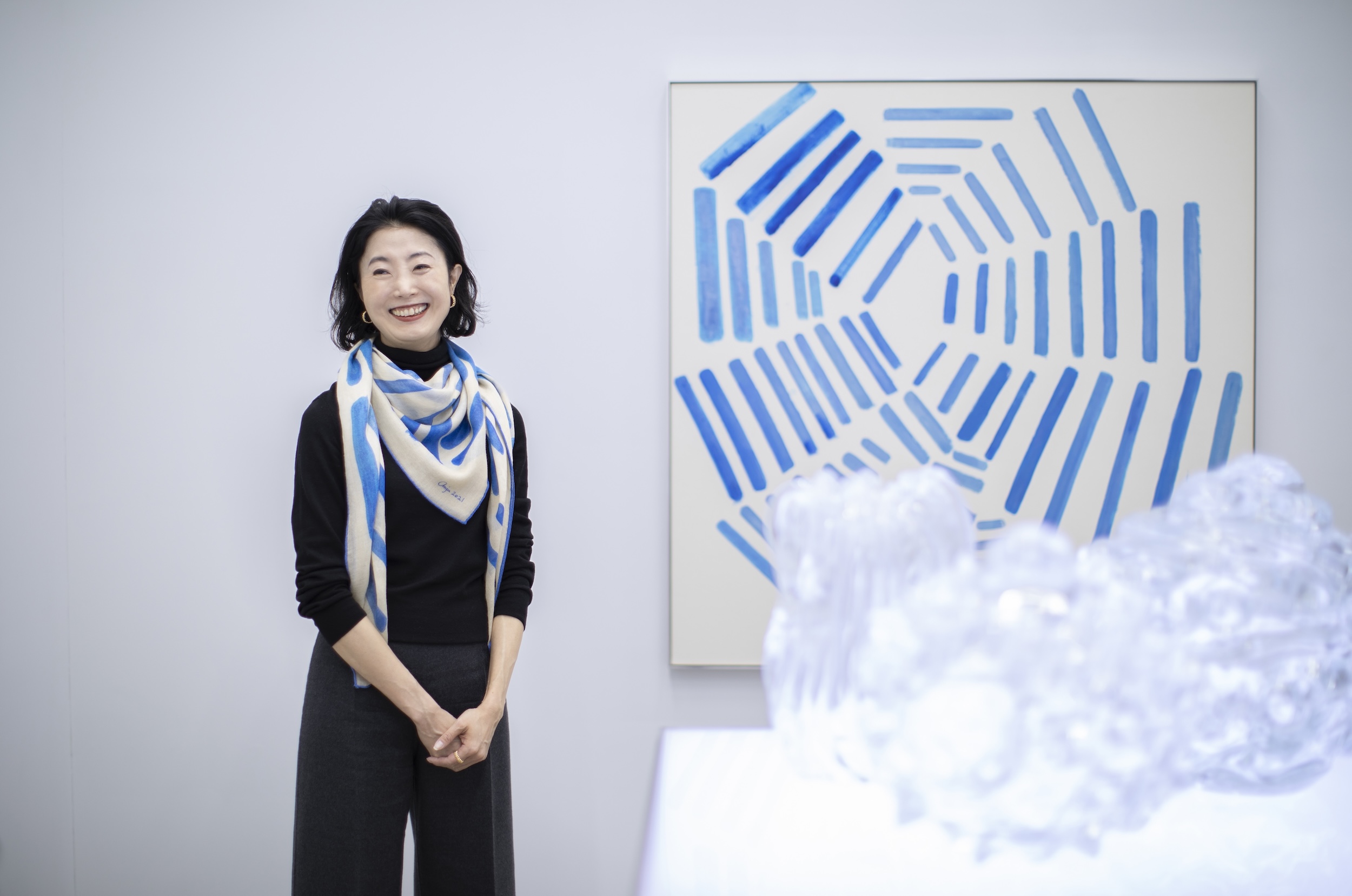 その三嶋さんを通じて知り合ったのが、ここShugoArtsとアンジュさんです。アンジュさんの作品も購入していますが、のびやかに心のままに描かれている感じがとても素敵です。ロロ・ピアーナ在籍時にアーティストとのコラボレーションを企画するチャンスがあり、イタリアのCEOにアンジュさんを推薦し実現しました。そのプロジェクトで制作していただいた連作の一つ、『Ray 4』という作品も今回展示してくださっています。ちなみに今日私が身に着けているスカーフは、このシリーズから実際に商品化したものなんです。