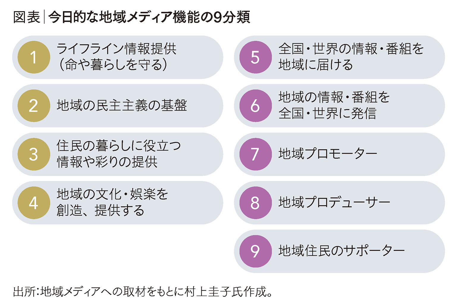 須賀:私はTVerへの出向から戻ったいまも、ローカル局の皆さんとローカル局の存在意義を議論する機会も多いのですが、村上さんがまとめられた「今日的な地域メディア機能の9分類」がわかりやすく、何度も紹介してきました。