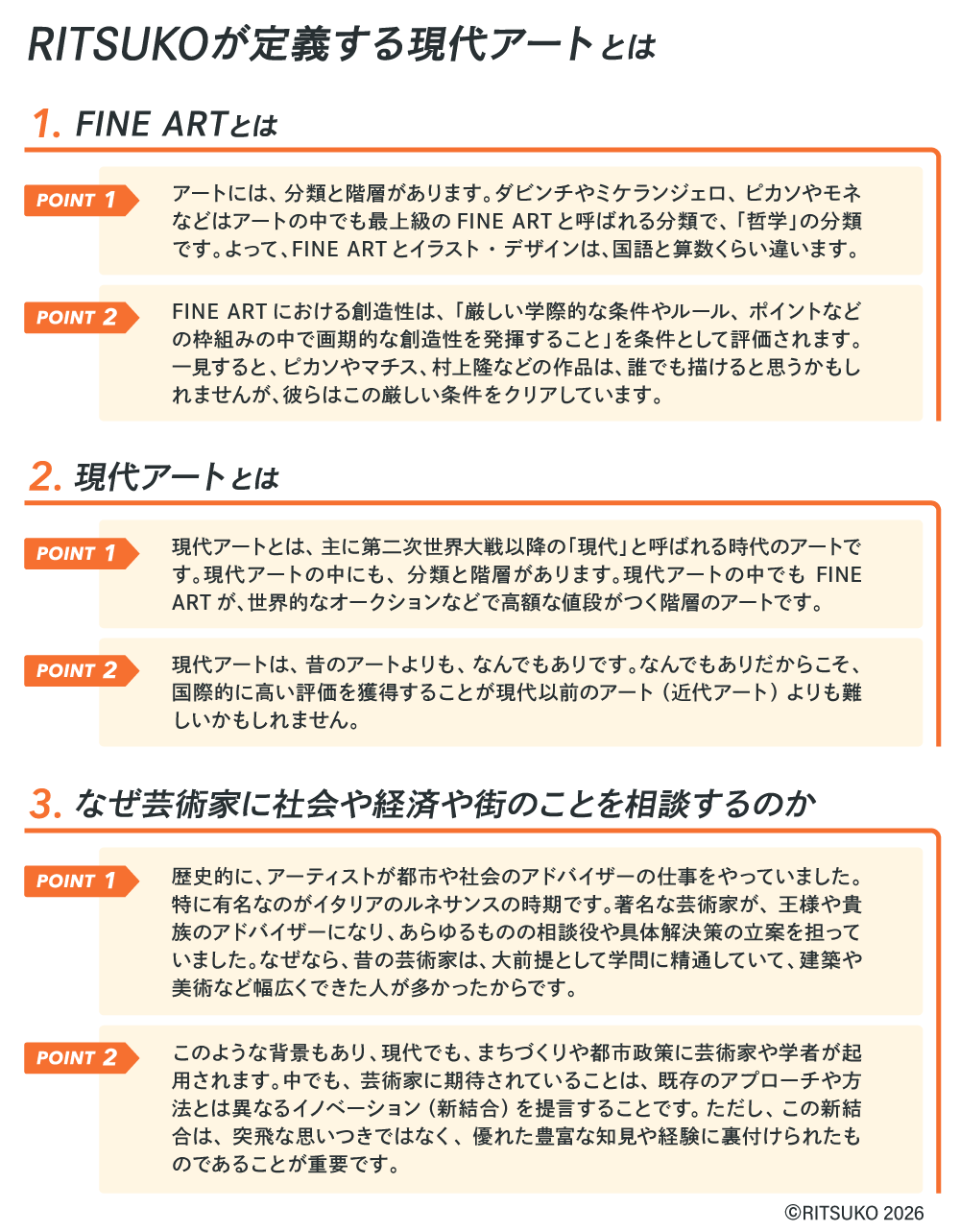 現代アートってそもそも成り立ちが「哲学」なんですね。ギリシャ時代からの考え方で、全ての科目の原点をつかさどるものがArts。そこからユダヤ教的な考え方も入り、金融資産的な価値とアカデミックが融合した市場が現代アートと呼ばれるものになります。ただ、この系譜を理解せず、表面上の現代アートをまねするだけのアーティストも多数いるんです。