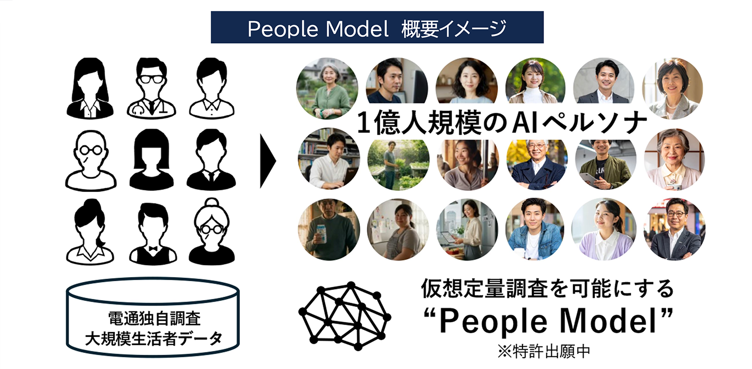 西村:「People Model」とは、電通独自の大規模生活者データ15万人分を統計的に分析し、そのパターンを日本の人口構成に合わせて拡大させながら、1億人規模のAIペルソナを生成する技術です。これにより、AI上で「人」と「市場」を再現することが可能になります。