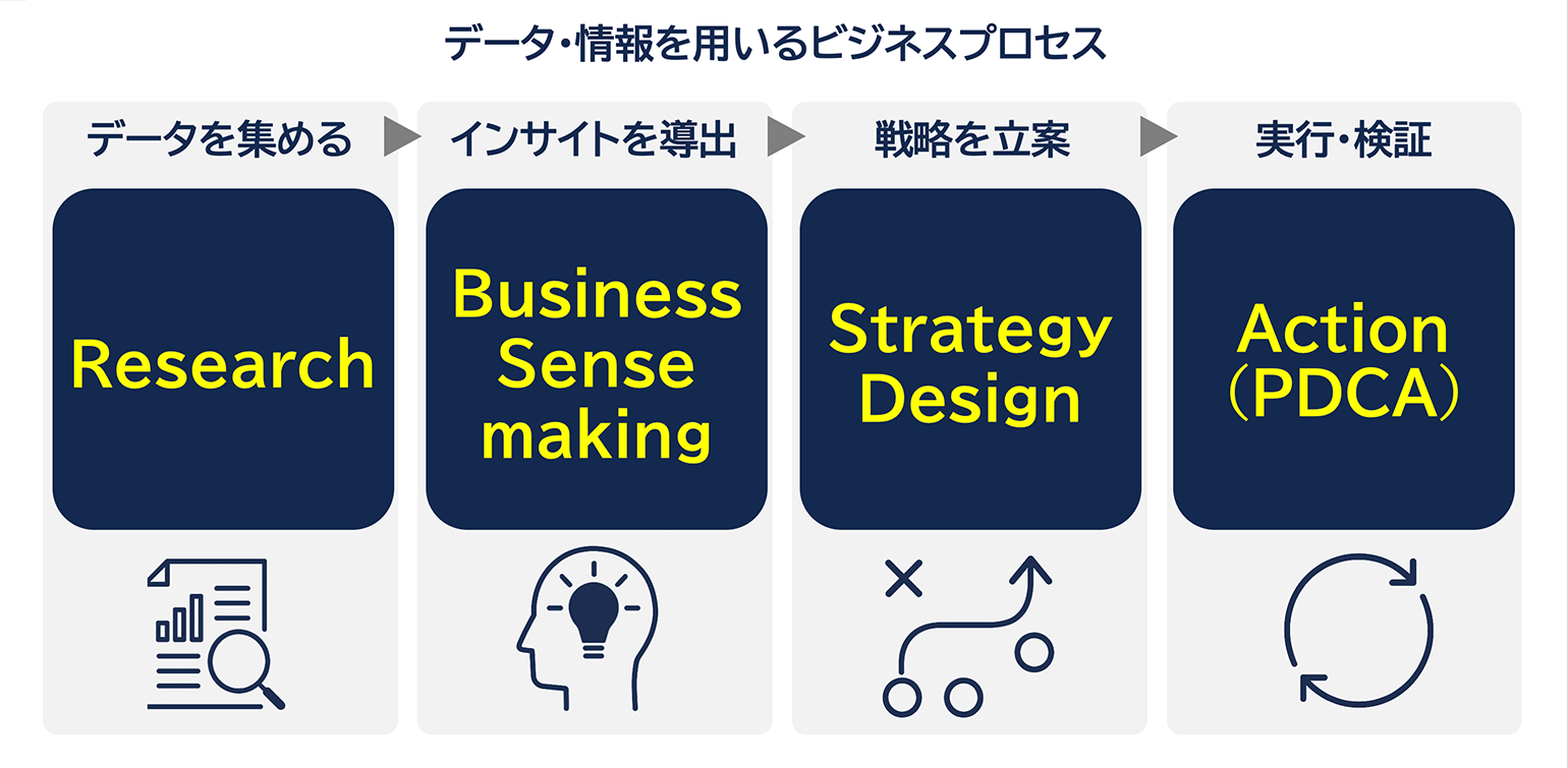 データを用いるビジネスプロセスにおいては、データを集める→戦略を立案→実行・検証という流れ一般的ですが、私たちは、データ収集と戦略立案の間に、「インサイト導出(Business Sensemaking)」というプロセスを付け加えています。
