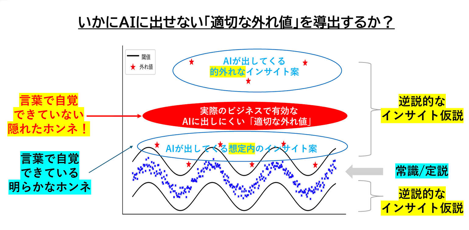 適切な外れ値というのは、AIが出してくる想定内のインサイトと、的外れなインサイトの中間にあるもので、じつはそこに、言葉で自覚できていない隠れた本音(インサイト)があるのではないかと思っています。