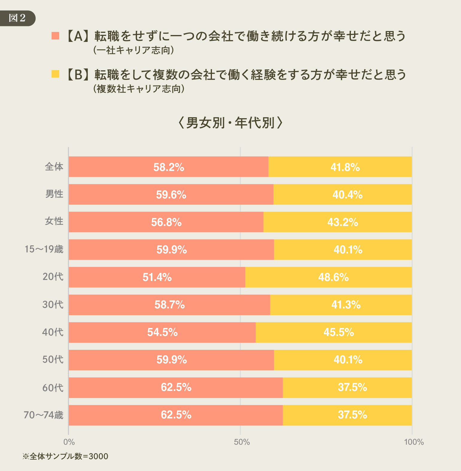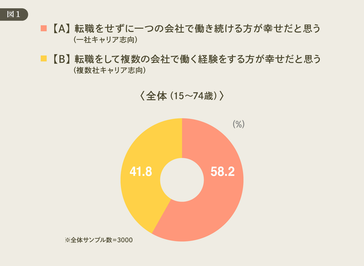 全体(15~74歳)の結果では、「【A】転職をせずに一つの会社で働き続ける方が幸せだと思う(以下、「一社キャリア志向層」)」が58.2%、「【B】転職をして複数の会社で働く経験をする方が幸せだと思う(以下、「複数社キャリア志向層」)」が41.8%となりました。