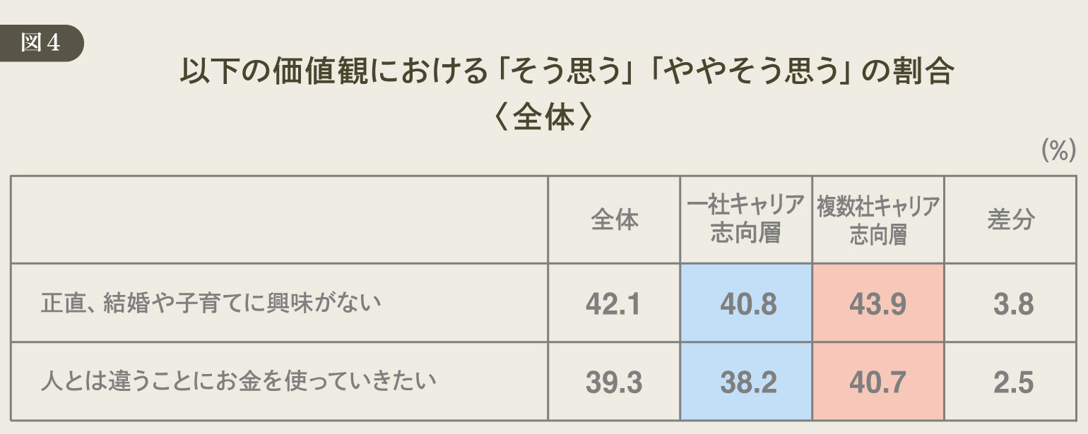 では、こういった就労意識について、「一社キャリア志向層」と「複数社キャリア志向層」といった全く別の価値観を持つ人々は、どういった特徴があるのか。ここからは他の意識価値観に関する設問の回答からその違いを紐解き、それぞれの層への理解を深めたいと思います。