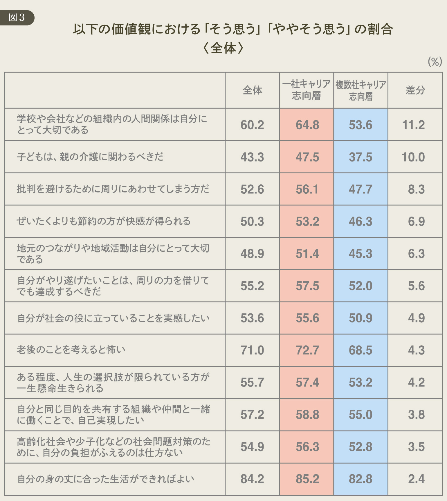 言い換えると、「一社キャリア志向層」は社会/組織/地域/家族……といった社会規範をある程度強く内面化している一方で、「複数社キャリア志向層」はそれらを必ずしも、自分の価値観として持っていないことが見えてきました。