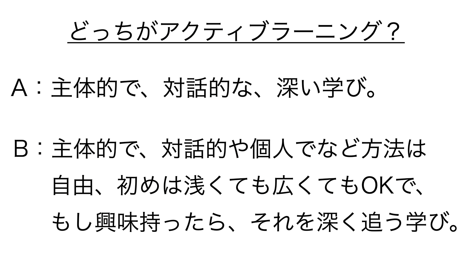 対話的でないとダメ、深くないとダメ、って決めちゃったら、主体的でなくなって、ノットアクティブになっちゃう。