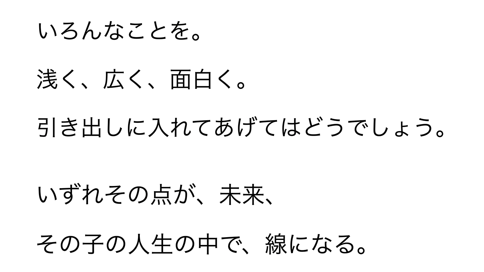 先のことはわからない。でも、子どもたちのそれぞれの人生の中で、そのときの状況に合わせて、大人たちが授けた点と点が結びついて、線になる。つまり、独自の答えをそれぞれが出す。