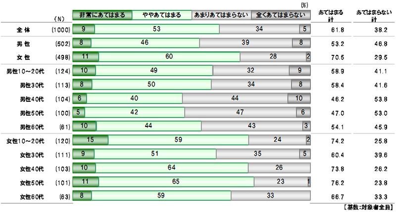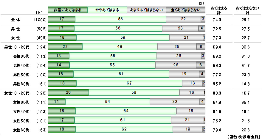 ・83% of "Eco-Women" are interested in environmental issues, exceeding the overall average of 75% and showing awareness levels second only to men in their 60s. Furthermore, 26% strongly agree ("very applicable"), indicating intense interest.