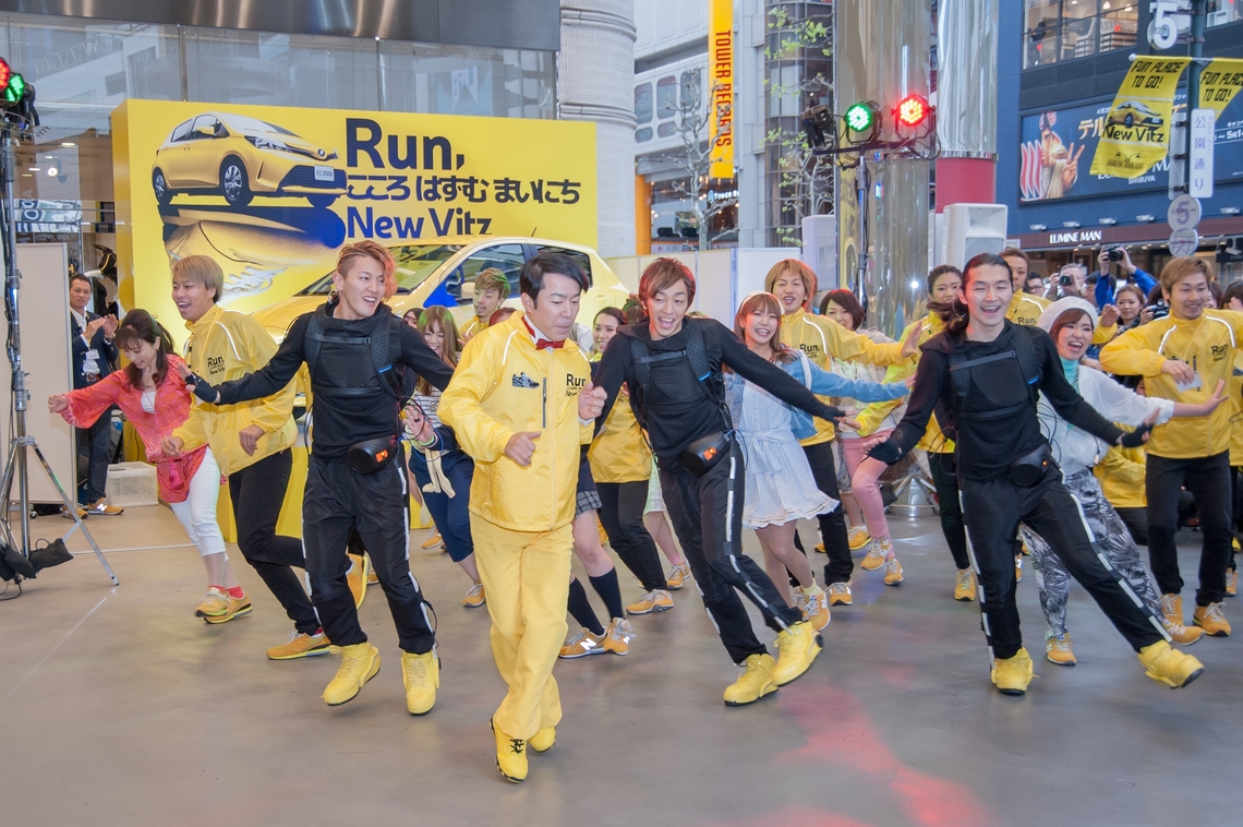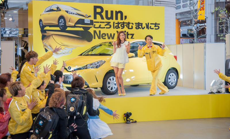 Toyota Motor Corporation held a PR event for its new Vitz model at various locations in Shibuya, Tokyo, on April 21. The vehicle features a new engine for improved fuel efficiency and a completely redesigned exterior. Sales commenced the same day under the catchphrase "Run, heart-pounding everyday."