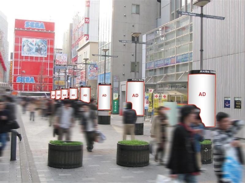 The "Akiba Wi-Fi Cylinder" is a new outdoor advertising medium featuring a unique viewing angle. It was jointly developed by Akiba Town Management Co., Ltd. (the advertising media company established to continuously enhance the appeal and revitalize the Akihabara area) and OMS.