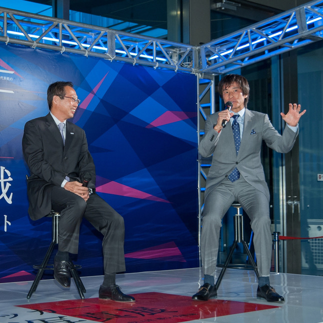 In the opening talk, former national team player and sports journalist Tetsuo Nakanishi touched on topics related to the national team members, stating, "I believe this year marks the beginning of Japan's quest to win the World Cup. Winning in 2030 is the goal. The possibility is not zero." The evening talk featured Takeshi Okada, who coached the team at the previous South Africa tournament, and former national team player Masashi Nakayama. Okada stated, "Among the teams in the qualifying group, Japan has the highest overall strength and could finish first. I expect them to reach the quarterfinals or semifinals." Nakayama added, "I hope they cherish their fighting spirit and show the world Japan's strength," while their humorous banter also energized the venue.