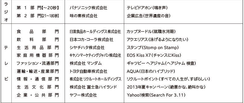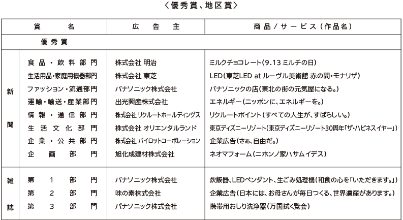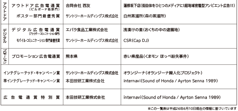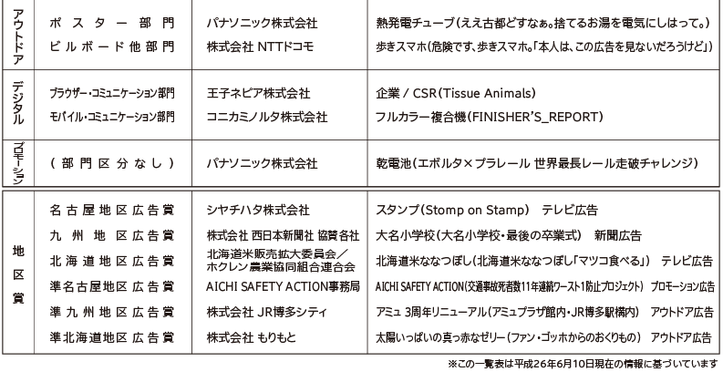 ・The "Honorable Mention Newspaper Advertising Dentsu Inc. Award" and "Honorable Mention Television Advertising Dentsu Inc. Award" have been discontinued.