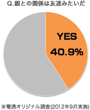 Within this mainstream warm family environment of today, 40% of young people describe their relationship with their parents as being like friends. It seems they are growing up in a frank, friendship-like relationship while still valuing time with their parents.