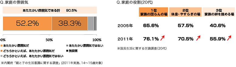 In a 2011 Cabinet Office survey on lifestyle attitudes among parents and children, 90.5% described their home atmosphere as "warm." Similarly, the Cabinet Office's National Life Survey (for those in their 20s) shows a growing tendency to consciously view the home as a "place for family gatherings," "a place of peace," and "a place to deepen bonds."
