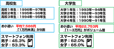 Some of you may be wondering, but we've deliberately avoided defining "Wakamon" as we enter the fourth installment of this column. The reason is that we at Dentsu Inc. Wakamon Project believe "real life can't be seen through generation or gender alone." That said, when it comes to financial situations, high school and college students differ in both their allowances and disposable income (obviously!). This time, we'll focus on high school and college students.