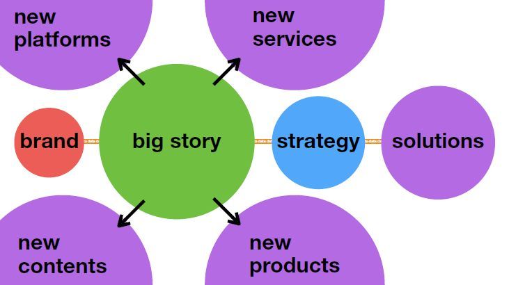 Furthermore, having a "Big Story" makes it easier to expand solutions beyond advertising into various domains like new services, products, apps, content, and platforms.