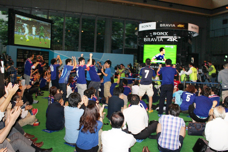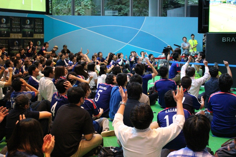 The venue for the "2014 FIFA World Cup Brazil Public Viewing in Marunouchi" at Tokyo's Marunouchi Building in Chiyoda Ward was packed with over 200 enthusiastic supporters who rushed to the event despite the 5:00 AM kickoff. When Okazaki scored the equalizer, loud cheers and applause echoed through the early morning Marunouchi area. Public viewings at this location will continue throughout the tournament.
