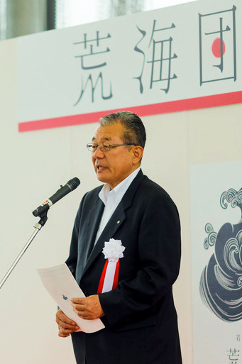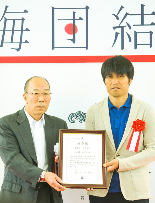 At the subsequent appointment ceremony for honorary members of the Araumi-dan (Rough Seas Group), Shigeo Ono, Chairman of the Noda Village Fisheries Cooperative and representative of the Araumi-dan, appointed former Japanese national soccer team member Tokuo Komura. Komura offered encouragement, stating, "I want to promote the Araumi-dan nationwide. I hope that in four years, both Japanese soccer and the Araumi-dan will be thriving." |