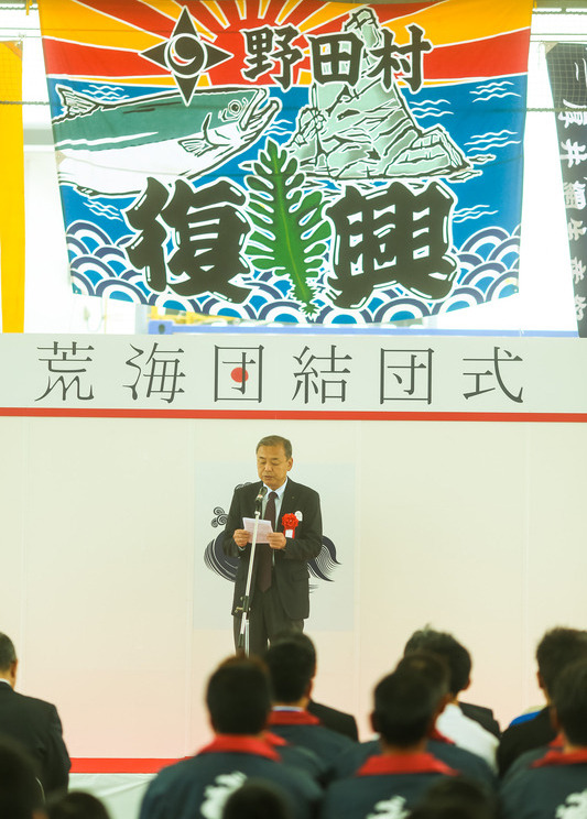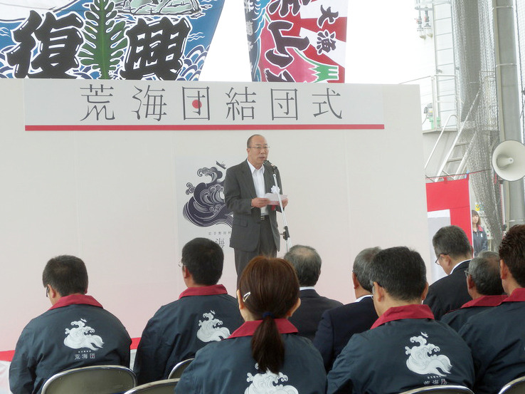 Mr. Kazuaki Igarashi, Director of the Fisheries Promotion Division at the Iwate Prefecture Northern Regional Development Bureau, read a congratulatory message from Mr. Sadao Takahashi, Director of the Fisheries Department: "The Araumi-dan is a project worthy of being a model for recovery. We wish to cooperate in establishing its brand." |