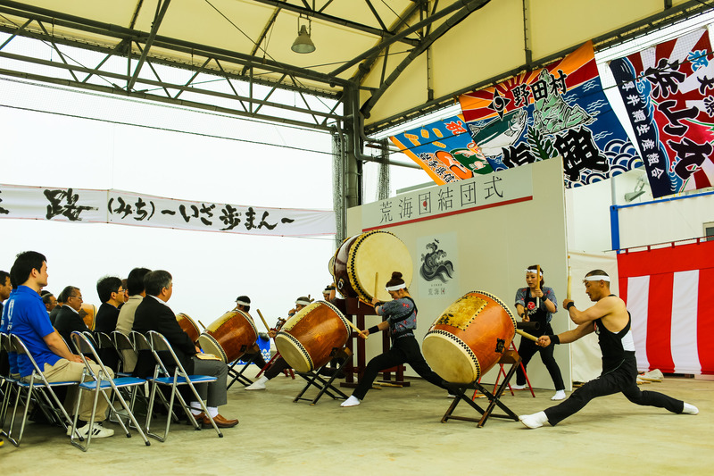 At the Araumi Scallop Shipment Ceremony, following the ribbon-cutting, the first shipment truck departed amid the resounding, spirited celebratory performance by the village's Namomi Taiko drum group.