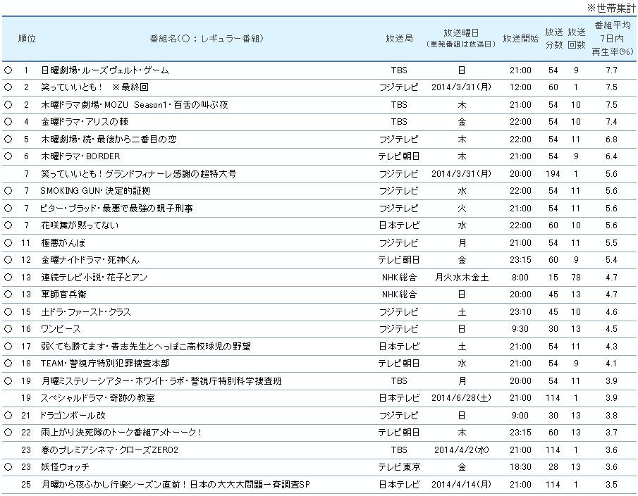 List of programs with high timeshift viewing (program playback within 7 days) from April to June 2014 (Monday, March 31, 2014 to Sunday, June 29, 2014)