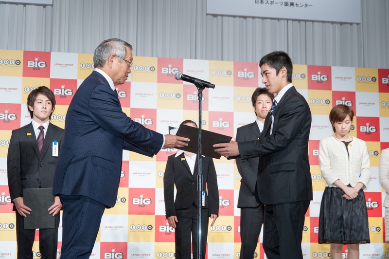 Twelve top athletes representing those receiving athlete grants took the stage. Grant certificates were presented to gymnasts Kohei Uchimura and Kenzo Shirai, swimmer Takeshi Matsuda, track and field athlete Genki Dean, and table tennis players Kasumi Ishikawa and Ai Fukuhara. The athletes expressed their gratitude for the grants and stated their determination for the Olympic and Paralympic Games to be held in Rio de Janeiro in 2016 and Tokyo in 2020.
