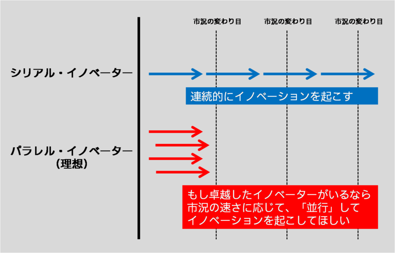 This seems to occur only within companies not implementing network-based innovation. Companies attending innovation management conferences, for instance, are often unaware of their own "patterns." If they have serial innovators, they express a preference: "Rather than having them produce innovations serially (one after another), we want them to generate innovations in parallel, simultaneously." This stems not only from the rapid pace of market changes but also from the issue of the tenure of those responsible for innovation (the deadline for delivering results).