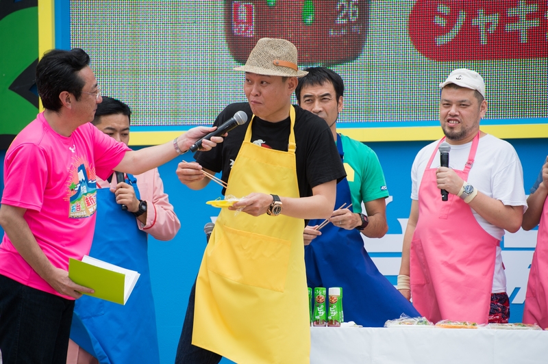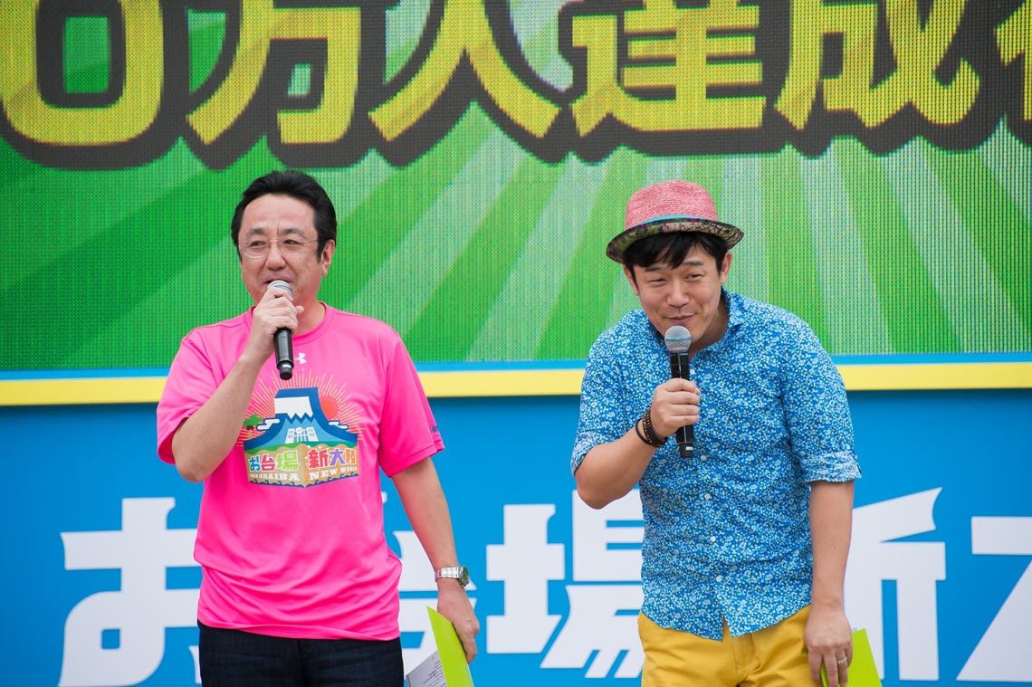 Comedy duo Penalty's Hide and Fuji TV announcer Masaharu Miyake appeared on stage. They called out squad members Seiji Chihara and Wacky (Penalty), Razor Ramon HG, along with the duos Yasei Bakudan, Dainoji, and 2007, plus special squad member Kazuhisa Ishii. The stage area quickly filled with attendees eager to see the popular comedians.