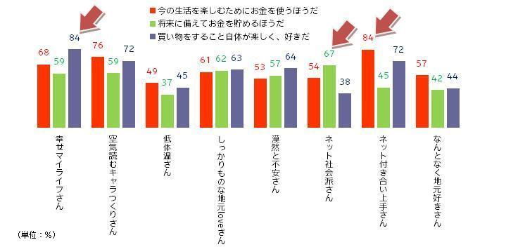 What about their consumption mindsets? "Net Socializers" scored higher on "I spend money to enjoy my current life (84%)", showing a proactive stance toward consumption that enriches the present. Conversely, "Net Socialists" scored higher on "I save money to prepare for the future (67%)", revealing a conservative consumption mindset. "Happy My Life" scored high on "Enjoy shopping itself. Love it (84%)", indicating a love for shopping. Since this cluster includes many working women, the amount of disposable income they have may also be a factor.