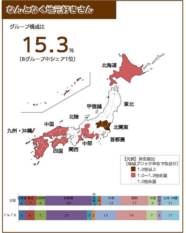 Young people who are "down-to-earth and love their hometown" because their attachment drives them to focus on the community, take interest, and act. Young people who "just kind of like their hometown" despite their attachment, but don't actually take much action or show strong interest. Comparing the regional distribution of these two clusters to the national average reveals a characteristic pattern: the former are more prevalent in the Chubu and Kyushu/Okinawa areas, while the latter are more common in the North Kanto area.