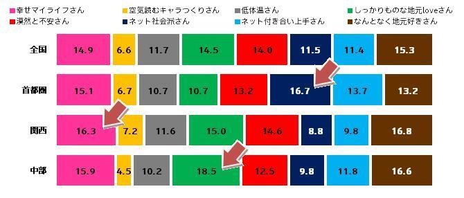These eight youth patterns aren't simply divided between urban and rural areas; they're dispersed nationwide. That said, just as "Kansai youth are like this" or "Nagoya is like that" often become topics reflecting local culture and regional characteristics, distinct area-specific traits emerge. Compared nationally, the "Net Society-Oriented" group is more prevalent in the Tokyo metropolitan area (16.7%), while the two clusters characterized by strong local ties are somewhat less common. For instance, "Happiness My Life" types are slightly more common in Kansai (16.3%), while the Chubu region has a higher proportion of "Down-to-Earth Local Love" types (18.5%).