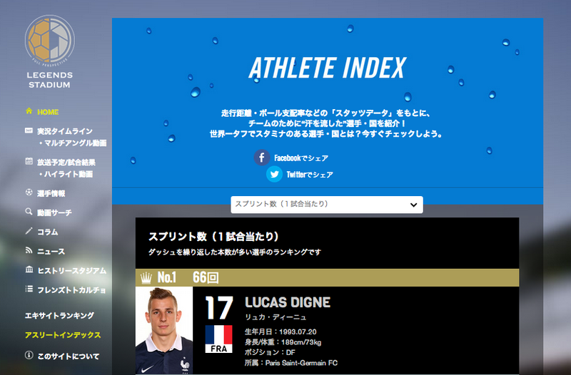 Finally, as previously mentioned in Mr. Yoshizawa's article " Sporolution × Technology: Start 'Augmented Viewing' Today! ", the online video service "LEGENDS STADIUM 2014" was also implemented during the recent World Cup. This service not only delivered highlight videos but also utilized data. The "Athlete Index" ranked players based on various metrics beyond goals, such as distance covered per match and top speed. Incidentally, the top player for number of sprints per match (ranking players by the number of repeated dashes) was France's Lucas Digne (66 sprints). The top player for our Japanese national team was... Nagatomo (49 sprints).