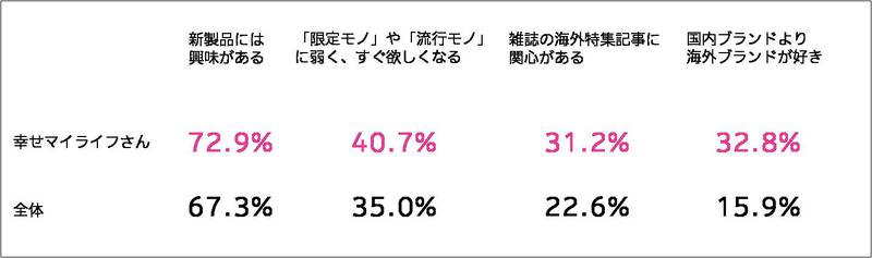A characteristic of "Happy My Life" users is a strong tendency toward being trend-followers, often liking new things, trendy items, or foreign goods.