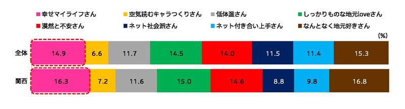 Our cluster analysis revealed a distinctive feature of the Kansai region: the proportion of "Happy My Life" types is higher here (16.3%) compared to the overall average (14.9%).