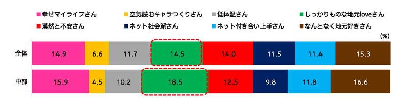 A defining characteristic of the Chubu region is the higher proportion of "Down-to-Earth Local Lovers" at 18.5%, compared to the national average of 14.5%.