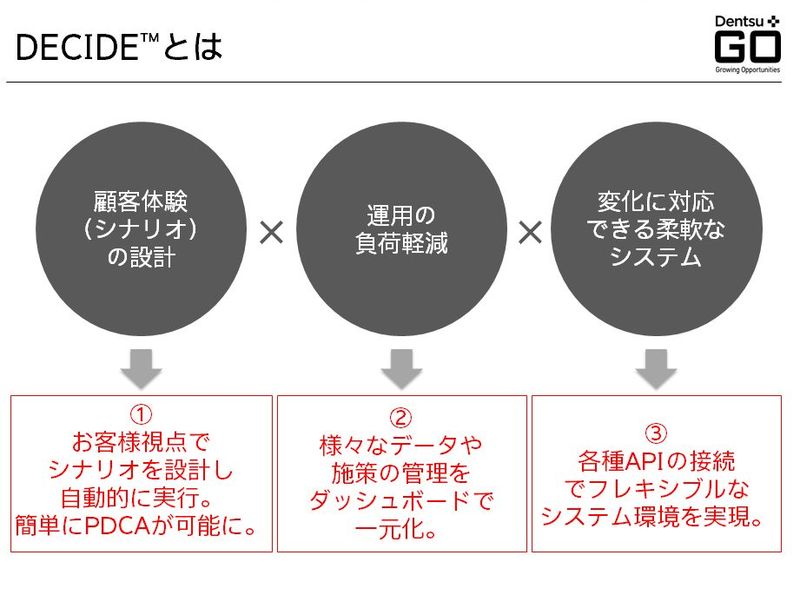 Meanwhile, as discussed with Mr. Takeshita of S-Cubism Technology, operating an e-commerce site also demands considerable effort. This includes extracting and analyzing diverse data, implementing strategies based on that analysis, and feeding back the results. To streamline these tasks, Dentsu Inc. and S-Cubism Technology developed "DECIDE," an e-commerce platform that helps discover winning scenarios. DECIDE is a tool that centrally manages e-commerce functions and data, enabling their deployment into strategies. It simplifies EC site operations and reduces workload. Its key features are: "Customer Experience (Scenario) Design," "Reduced Operational Burden," and "A Flexible System Adaptable to Change."