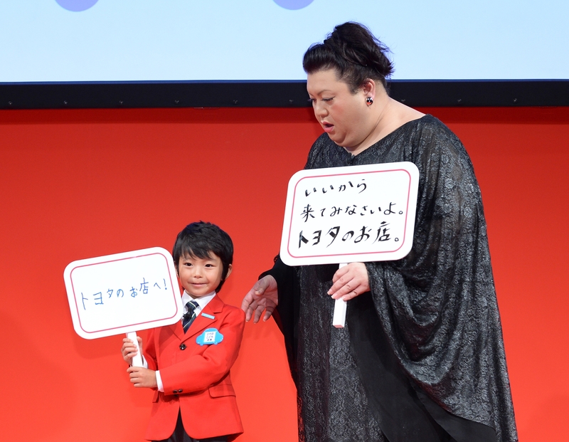 Just like in the commercial scene, the two wrote messages on placards and displayed them. Matsuko appealed, "Just come and see for yourself. Toyota dealerships," while Kenshiro urged, "Head to Toyota dealerships!"