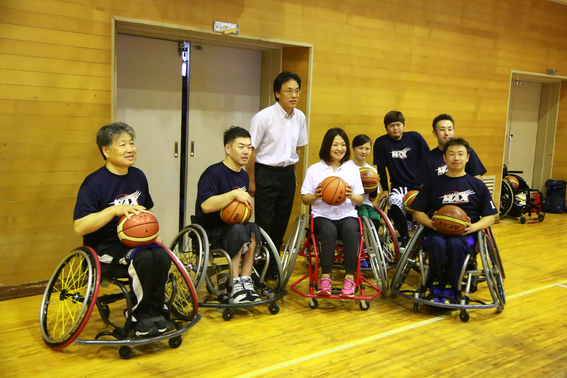 Following this, Miyagi Max's Coach Iwasa and players led a wheelchair basketball experience session. Students received instruction from the players and coaches, maneuvering the wheelchairs with unfamiliar movements as they tried their hand at basketball. During a game experience where student representatives teamed up with Sato against Miyagi Max players, cheers erupted from the watching students whenever a shot went in.
