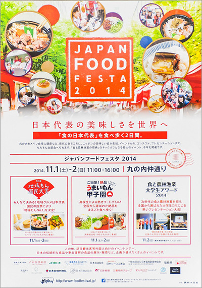The Ministry of Agriculture, Forestry and Fisheries will holdthe "Japan Food Festa 2014 " event, where visitors can sample representative Japanese foods, on November 1st and 2nd along Marunouchi Naka-dori in Chiyoda Ward, Tokyo. Now in its third year, this festival aims to let attendees experience the value of "food" and "food culture" produced by agriculture, forestry, and fisheries by offering ingredients and dishes from across Japan for them to actually taste.