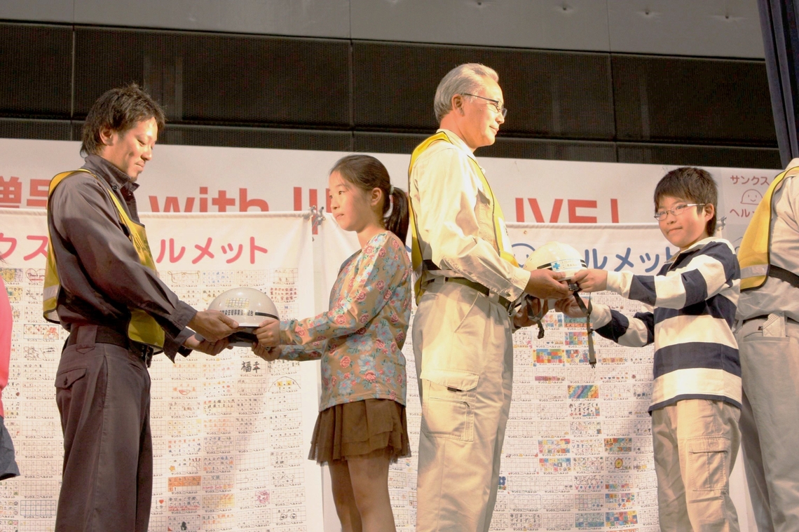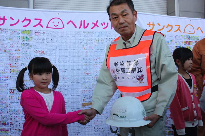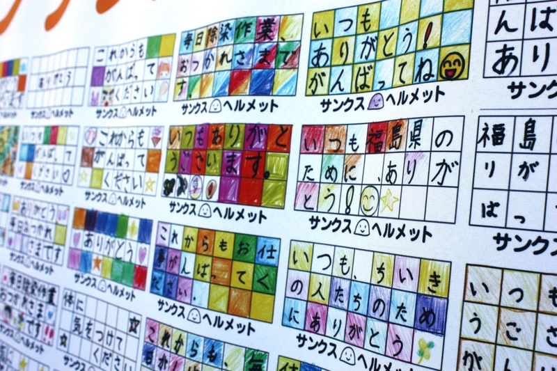 "ONE Fukushima" is a collective term for the team and its initiatives, formed by prefectural media outlets united by a shared commitment to Fukushima's recovery. This event was initiated by numerous emails sent to Fukushima FM from listeners, including those engaged in reconstruction work and residents of the prefecture. With the cooperation of various media outlets, it was implemented to promote mutual understanding and exchange. Elementary and junior high school students in Koriyama City wrote messages of gratitude and support for decontamination workers. These messages were printed on stickers and affixed to helmets, which were then presented as "Thanks Helmets."