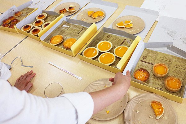 Next came the prototyping phase. Rather than just talking about it, we decided to create while thinking, "What would be an egg tart worthy of an egg artisan?" As we made prototypes, we shared our impressions: "This one's just plain ugly," "Looks cute at first glance, but lacks that egg aroma," "The flavor's too monotonous for eating one whole tart," and so on. We moved forward, all members sharing their sensory feedback. We amateurs said some pretty rude things to professional pastry chef Midori Takayama, but the result was an egg tart we could be confident in – one with a unique flavor you won't find just anywhere.
