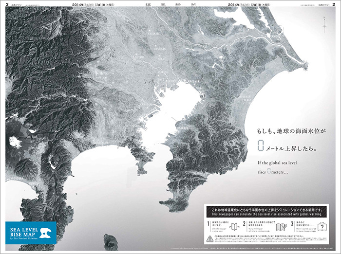 Thermochromic ink is a special ink that repeatedly changes color within a specific temperature range. Utilizing this property, a four-page color tabloid insert was created to allow readers to physically experience sea level rise caused by global warming. It was inserted into the December 11th morning edition in the Tokyo 23 wards area. Approximately 800,000 copies were distributed.