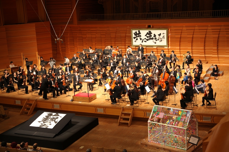 The main concert, " Colors You Hear, Sounds You See," began with a calligraphy performance by calligrapher Shoko Kanazawa. As Kanazawa powerfully wrote the character "藝" (art), the audience responded with thunderous applause. The audience was then treated to an aria sung by soprano Natsuki Hashimoto, a performance on the đàn bầu (Vietnamese monochord) by Mr. Nguyen Thanh Tuan, and a concerto performed by violinist Narimichi Kawahata and Geidai Philharmonia concertmaster Chiyomitsu Noguchi. The finale featured a joint performance by the Geidai Philharmonia and the HEARTS of VISION CHAMBER ORCHESTRA, the world's only chamber orchestra composed of visually impaired musicians from South Korea. This arrangement allowed people with disabilities to experience the live sound of an orchestra firsthand on stage.