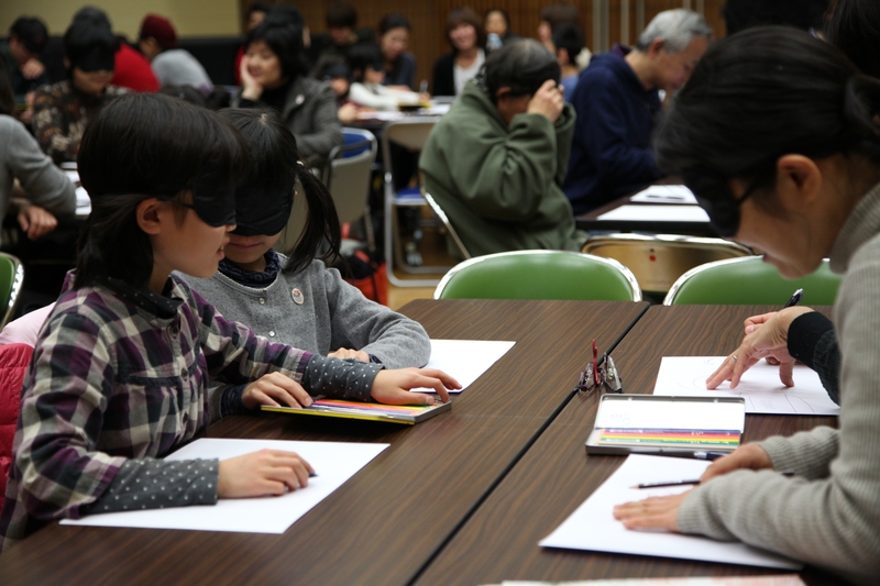 At the workshop " Blindfold Drawing: Let's Play in an Imaginary World," visually impaired artist M. Namae served as instructor. Participants challenged themselves to draw while wearing blindfolds, experiencing the process without sight. Mr. Namae explained that even with eyes closed, anyone can write their own name, and those who regularly draw can still create art with their eyes shut. He advised, "It's not about doing it well; just enjoy drawing." When Mr. Namae drew houses and animals at the children's request, cheers erupted from the audience. Mr. Namae remarked, "When one ability is restricted, previously unknown abilities can sometimes emerge."
