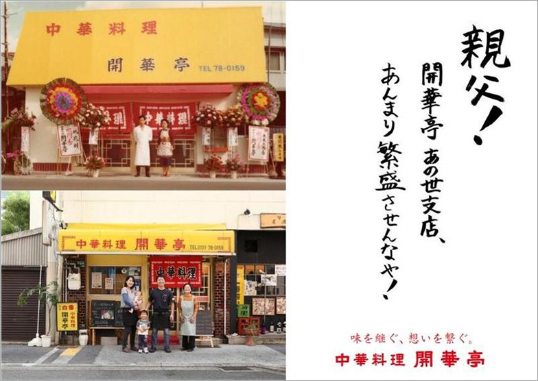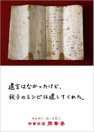 Matsushita: The info from the first or second interview isn't that meaningful. What the shop owner immediately pushes—"Make us a poster like this!" or "Our selling point is this!"—is usually obvious just by looking. Of course, that's still important foundational info. But around the third interview, when they're running out of things to say, if you persistently keep asking questions, they'll sometimes blurt out a great story out of desperation. Take Kaikatei, the Chinese restaurant I worked with this time. At first, they said, "Make a poster like my family's soaking in a bath of mapo tofu." Then I kept going back, persistently asking questions. During the third interview, they mentioned they kept the recipes left by the previous owner, the old man, in the kitchen and showed them to me. That's it! That's exactly what I was waiting for! I used that as the concept.