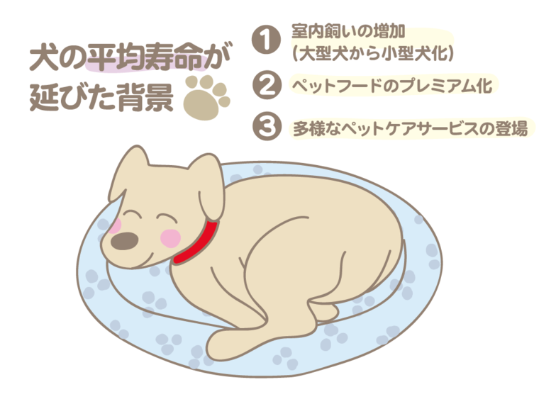 Looking at surveys conducted by the Japan Pet Food Association, the average lifespan of dogs was 13.9 years in 2011 and increased slightly to 14.2 years in the latest 2013 data. It is said that pet lifespans have increased dramatically over the past decade or so due to changes in the environment in which they are kept.